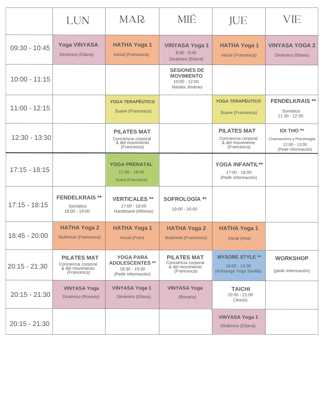 Ofrecemos clases de Yoga Vinyasa, Hatha Yoga, Yoga Terapéutico, Pilates y Taichí, con diferentes opciones de bonos: